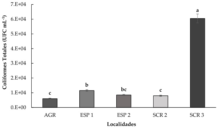 Los análisis evidenciados en la Figura 2 identifican diferencias significativas en los conteos de coliformes entre las localidades, con AGR y SCR 2 presentando los conteos más bajos, alrededor de 1000 UFC mL-1. ESP 1 muestra un conteo mayor, aproximadamente 1800 UFC mL-1, clasificado, mientras que ESP 2 tiene un conteo intermedio de aproximadamente 1200 UFC mL-1. En contraste, SCR 3 presenta el conteo más alto, con aproximadamente 60 000 UFC mL-1. Estas variaciones indican una posible influencia de factores locales en la contaminación por coliformes en el agua de las diferentes localidades, destacando SCR 3 por su alta concentración de coliformes, lo que sugiere una fuerte fuente de contaminación o condiciones muy favorables para el crecimiento bacteriano.