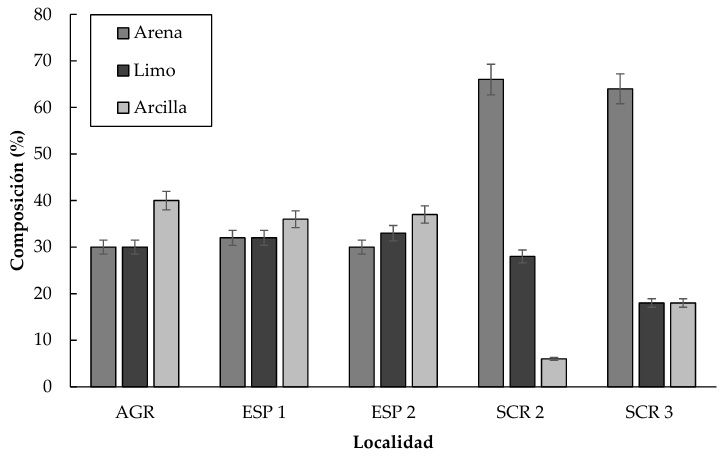 Los estudios de tipo de textura de suelo (Figura 3) revelaron que AGR presenta una composición balanceada con aproximadamente 30% de arena, 30% de limo y 40% de arcilla. ESP 1 muestra una distribución similar con 30% de arena, 3 % de limo y 35% de arcilla. ESP 2 tiene una composición equilibrada de alrededor de 30% de arena, 30% de limo y 40% de arcilla. Por otro lado, SCR 2 y SCR 3 exhiben una marcada predominancia de arena, con aproximadamente 70% y 60% respectivamente, mientras que el limo y la arcilla constituyen proporciones menores. SCR 2 tiene aproximadamente 20% de limo y 10% de arcilla, y SCR 3 alrededor de 20% de limo y 20% de arcilla. Estas variaciones en la composición del suelo pueden influir significativamente en las propiedades físicas y químicas del suelo, afectando la retención de agua, la aireación y la disponibilidad de nutrientes para las plantas. La textura arenosa predominante en SCR 2 y SCR 3 puede implicar una mayor permeabilidad y menor capacidad de retención de agua, lo cual podría requerir ajustes en las prácticas de manejo del suelo y riego en estas localidades para optimizar la producción agrícola y la sostenibilidad del uso del suelo.