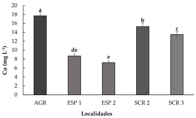 Las variaciones en la concentración de cobre (Cu) en el suelo de diferentes localidades pueden ser atribuibles a factores geológicos, prácticas agrícolas y fuentes de contaminación antropogénicas (Zhong et al., 2020). La alta concentración de cobre en AGR, con aproximadamente 18 mg L-1, podría estar relacionada con la composición mineralógica del suelo en esa área, que naturalmente contiene mayores cantidades de cobre (Chileshe et al., 2020). Otra posible causa es el uso de fungicidas y fertilizantes a base de cobre, que son comunes en la agricultura para combatir enfermedades de las plantas y pueden acumularse en el suelo con el tiempo (Tamm et al., 2022).