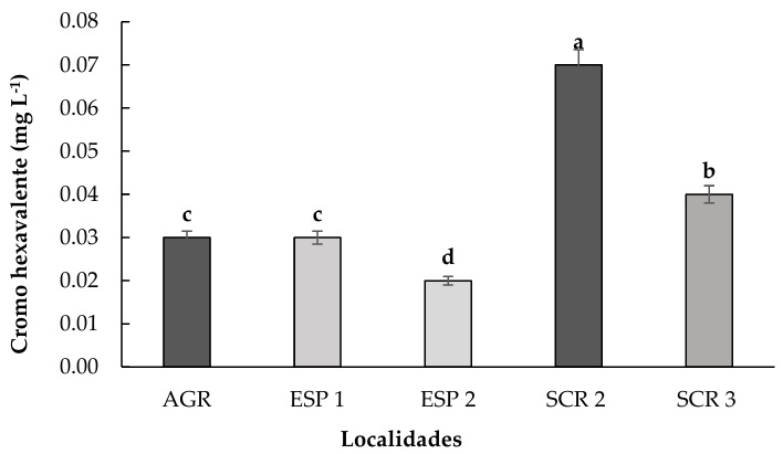 El análisis de la concentración de cromo hexavalente (mg L-1) en diferentes localidades (Figura 8), muestra variaciones significativas entre ellas. La localidad SCR 2 presentó la concentración más alta de cromo hexavalente, alcanzando aproximadamente 0.075 mg L-1, siendo significativamente mayor que en las demás localidades. La localidad SCR 3 también mostró una alta concentración de cromo hexavalente, con un valor alrededor de 0.040 mg L-1, aunque significativamente menor que SCR 2. Por otro lado, las localidades AGR y ESP 1 presentaron concentraciones de cromo hexavalente similares, ambas alrededor de 0.030 mg L-1 y sin diferencias significativas entre ellas. La localidad ESP 2 tuvo la concentración más baja de cromo hexavalente, con un valor alrededor de 0.020 mg L-1, diferenciándose significativamente de todas las demás localidades.