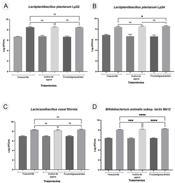 La concentración celular de Lpb. plantarum Lp22, Lp24, Lcb. casei Shirota (Fig. 2A, B, C) y B. animalis subsp. lactis Bb12 (Fig. 2D) incrementó dos ciclos logarítmicos (de 6 a 8 Log UFC/ml) al fermentar en el caldo MRS adicionado con huauzontle, siendo similar a los dos prebióticos testigo (FOS e inulina). Las cepas de Lcb. casei Shirota y Lpb. plantarum Lp22 y Lp24 no mostraron diferencias en el crecimiento celular. Sin embargo, el crecimiento de Bifidobacterium animalis subsp. lactis Bb12 fue menor en presencia de huauzontle y diferente (p<0.05) comparado con los tratamientos de inulina y FOS.