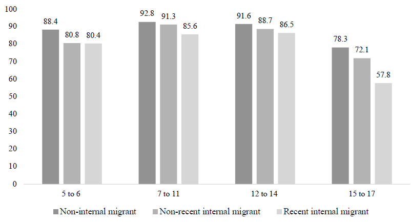 The low school enrollment of internal migrants is also noticeable in the age group of five to six years, especially when compared to non-migrants. Overall, 80.4% of recent internal migrants attend school, a figure similar to that of non-recent migrants, but lower than the 88.3% of non- migrants. It is essential to highlight that, from the age of 12 onwards, non-recent internal migrants also exhibit disadvantages in school enrollment compared to non-migrants.