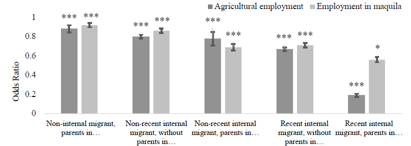 Graph 3 illustrates the interaction of internal migration with the agricultural and maquila employment of parents. In general, CA whose parents work in agriculture or the maquila industry have a lower probability of attending school compared to those with parents in other occupations (odds ratios lower than unity in all cases), and school enrollment is further diminished when they are recent internal migrants. Among recent internal migrants, the impact of parental agricultural employment on CA school enrollment is more pronounced than that of employment in the maquila industry.