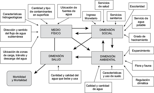 El estudio de la vulnerabilidad del agua subterránea a la contaminación y el subsecuente riesgo de afectación a la salud de los pobladores que la consumen es multidimensional, por lo que se requiere conjuntar información de salud poblacional y ambiental, ubicar sitios con alto peligro de contaminación y considerar la dinámica del agua subterránea, así como conocer los hábitos de uso y consumo de la población (Howard et al. 2006, Domínguez-Cortinas et al. 2012, Palomino-Moral et al. 2014, Mendoza-Cano et al. 2017, Andrade et al. 2018), como se muestra en la figura 1.