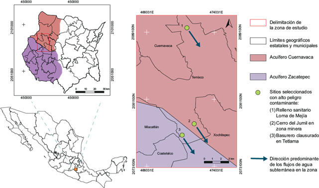 En la región norponiente del estado de Morelos se han identificado actividades y sitios con alta carga contaminante antrópica (un basurero a cielo abierto y un relleno sanitario) y de tipo geológico (que coincide con una zona concesionada a una minera), los cuales representan un peligro de contaminación para el agua subterránea (Ochoa-Chi 2014, Pohle-Morales 2020, SEMARNAT 2023). Además, existe el riesgo de afectación a la salud pública debido a que las inmediaciones de estos tres sitios se encuentran habitadas.