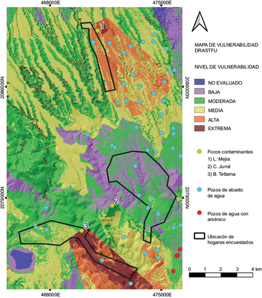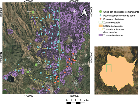 La aplicación de las encuestas para obtener información sociodemográfica y de salud de los pobladores se limitó a una distancia no mayor de 4 km de tres sitios identificados con alto peligro de contaminación. Por la dinámica del agua subterránea, se considera a los hogares de estas zonas próximas los de mayor vulnerabilidad. Los sitios identificados con alto peligro de contaminación para el agua subterránea en la zona de estudio fueron: