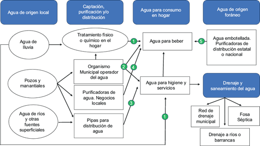 La principal fuente de abastecimiento de agua para los hogares es la red pública (BT, 57 %; LM, 63 %; y CJ, 95 %). Los tinacos de plástico y las cisternas de cemento son los medios más frecuentemente utilizados para almacenar agua. Los hogares que no se encuentran conectados a la red de agua potable la obtienen principalmente comprándola a particulares (servicio de pipas). La principal fuente de agua para beber son garrafones de purificadoras locales (LM, 58 %; CJ, 93 %; y BT, 97 %). El agua de la red pública es la principal fuente para beber en los hogares que no la compran en garrafones (14 % del total de hogares). De los hogares que beben agua de la red pública, el 38 % refiere que la hierven o le aplican gotas desinfectantes antes de beberla, mientras que en el porcentaje restante no se aplica ningún tratamiento. El gasto económico promedio que se realiza en cada hogar para abastecerse de agua (para beber y para uso diario) es del 7.8 % en CJ, 12.4 % en LM y 18.2 % en BT del ingreso monetario mensual promedio referido para cada sitio. En la figura 5 se muestra el diagrama general del origen del agua para uso y consumo humano encontrado en la región de estudio.