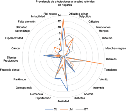 El cálculo de la prevalencia de afectaciones de salud se hizo dividiendo el número de casos referidos entre el número total de personas en cada grupo de estudio (225 personas en CJ, 180 personas en LM y 174 personas en BT), y multiplicando este resultado por 100. Para facilitar el análisis de las afectaciones de salud, se realizó la siguiente clasificación de las enfermedades consideradas: 1) problemas gastrointestinales (vómito y diarrea); 2) problemas de la piel (piel reseca, salpullido, infecciones por hongos y manchas negras en palmas de manos o plantas de los pies); 3) problemas renales (dificultad para orinar, cálculos renales, necesidad de diálisis); 4) problemas en el sistema nervioso (temblores, insomnio, ansiedad, demencia, enfermedad de Parkinson); 5) enfermedades metabólicas (anemia, diabetes, hipertensión); 6) cáncer; 7) problemas en huesos y dientes (osteoporosis, dientes manchados por fluorosis dental, dientes fracturados), y 8) problemas de atención y comportamiento en estudiantes (hiperactividad, dificultad en el aprendizaje, falta de atención e irritabilidad frecuente). Se aplicó el estadístico chi-cuadrado (con la prueba exacta de Fisher cuando fue requerido) para valorar diferencias significativas (p ≤ 0.05) en la prevalencia de enfermedades agrupadas para los tres sitios encuestados.
