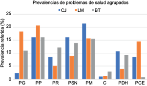 Fig. 7 Prevalencia de afectaciones a la salud (agrupadas) referidas por encuestados en los tres sitios dentro de la zona de estudio: Cerro del Jumil (CJ), Loma de Mejía (LM) y Tetlama (BT). PG: problemas gastrointestinales; PP: problemas en piel; PR: problemas en vías urinarias y riñones; PSN: problemas relacionados con el sistema nervioso; PM: problemas metabólicos; C: cáncer; PDH: problemas en dientes y huesos; PCE: problemas de comportamiento en estudiantes.