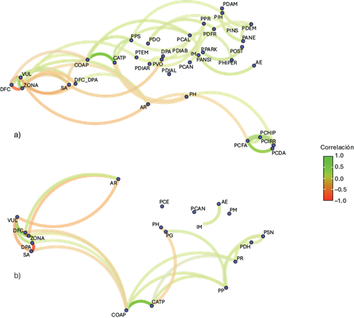 Las principales correlaciones positivas con significancia estadística (p ≤ 0.05) fueron: ZONA-VUL (0.73), SA-DFC (0.45) y AE-IM (0.42). Entre las variables de salud, los problemas de conducta en estudiantes presentaron las correlaciones positivas más elevadas: PCDA-PCIRR (0.75), PCDA-PCHIP (0.69), PCHIP-PCIRR (0.67), PCDA-PCFA (0.62) y PCFA-PCIRR (0.6). En enfermedades gastrointestinales se encontró la correlación PVO-PDIAR (0.48). Respecto a correlaciones con la cuestión monetaria, la correlación PPS-COAP es de 0.4 y PCAL-CATP de 0.34. Las principales correlaciones negativas con significancia estadística (p ≤ 0.05) fueron: DFC-ZONA (-0.84), DFC-VUL (-0.72), SA-VUL (-0.5), AR-VUL (-0.39). Al agrupar los problemas o afecciones de salud, las principales correlaciones con significancia estadística (p ≤ 0.05) fueron: PP-CATP (0.36) y PSN-PR (0.36). No se obtuvieron correlaciones con significancia estadística entre las variables contempladas con PM, PCAN y PCE (Fig. 8).