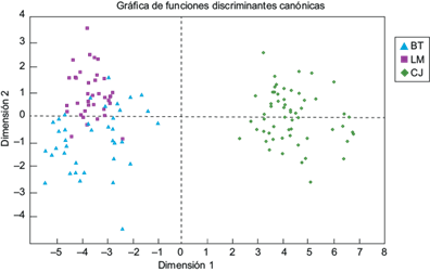 Fig. 9 Gráfica en plano del análisis de funciones discriminantes. Ordenamiento de los hogares encuestados en Cerro de Jumil (CJ), Loma de Mejía (LM) y Tetlama (BT).