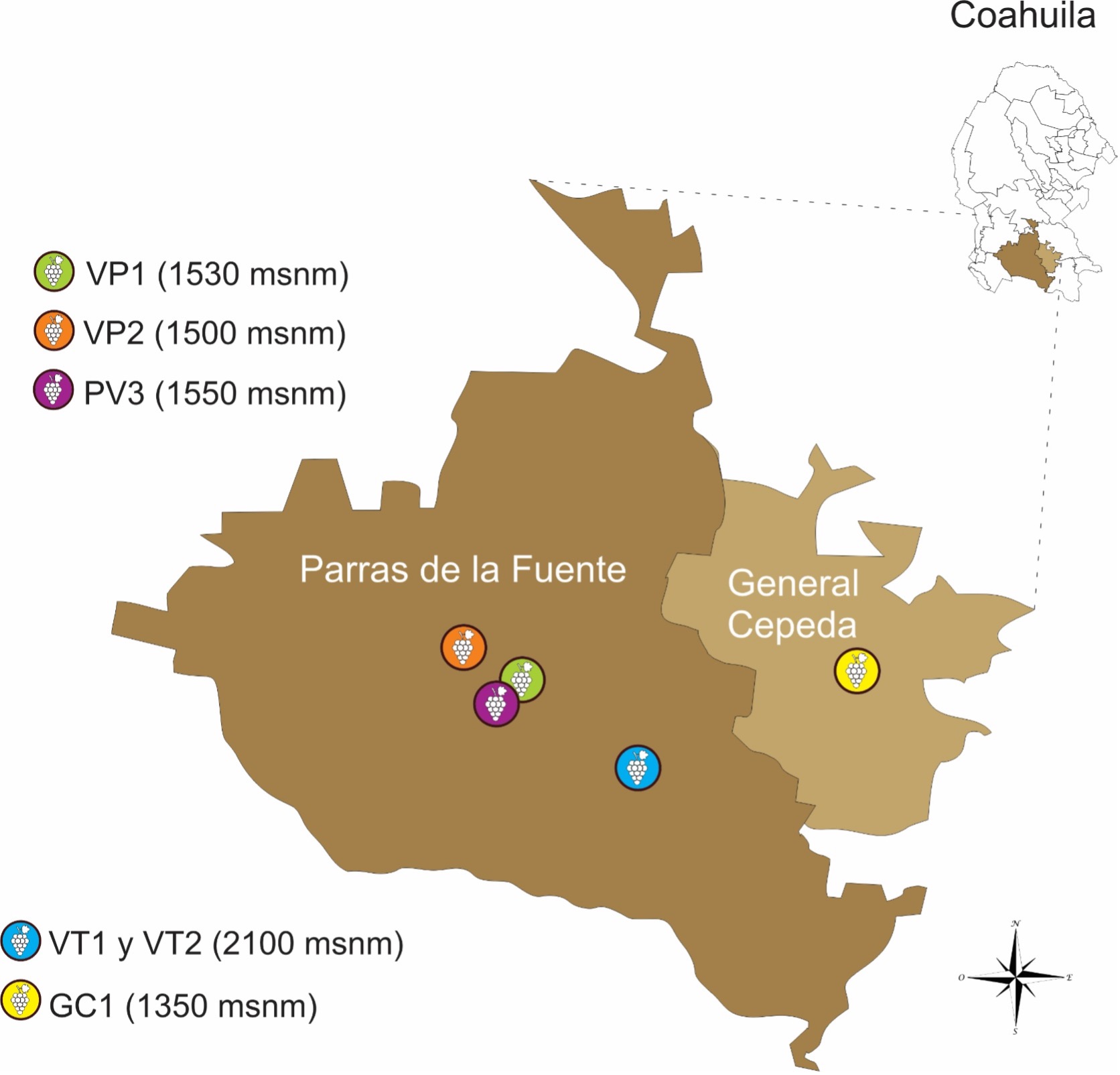 La región de las cuatro vinícolas ubicadas en el municipio de Parras, Coahuila, México, presenta un clima semiseco templado (BS1), con temperaturas medias anuales de 12 °C a 18 °C, con un rango bajo de precipitación que va de 100 mm a 600 mm, pero con una alta disposición de aguas subterráneas (Instituto Nacional de Estadística y Geografía [INEGI], 2010a). Por otra parte, la región en la que se ubica la vinícola GC1 presenta un clima seco semicálido (BS), con temperaturas medias anuales de 18 °C a 22 °C, con un rango de precipitación de 100 mm-700 mm (INEGI, 2010b).