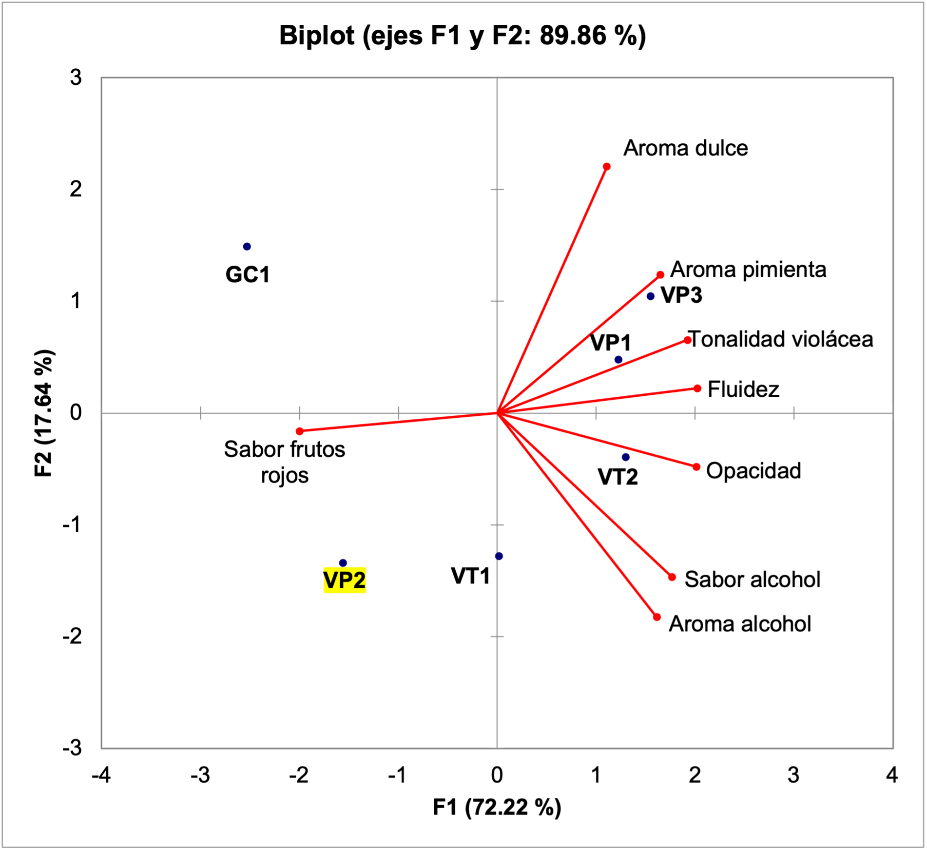 De acuerdo con la Figura 2, que permite visualizar en un Biplot los atributos sensoriales y las muestras de vino (mapa perceptual), se observa que los vinos GC1 y VP2 se caracterizaron por el sabor a frutos rojos, de acuerdo con la dirección de su vector, ubicado al lado izquierdo del componente principal 1. El vino VP3 se identificó con el aroma pimienta, aroma dulce, tonalidad violácea y fluidez; el vino VP1 se describió con los mismos atributos del vino VP3, pero con menor intensidad, de acuerdo con su posición con respecto a los vectores de los atributos previamente mencionados. El vino VT2 se ubicó en el cuadrante inferior derecho, relacionado con el sabor y aroma a alcohol, así como la opacidad. Esta visualización facilita la comprensión global de la información; sin embargo, no muestra un análisis estadístico de la significancia de las diferencias entre los tratamientos para cada descriptor.
