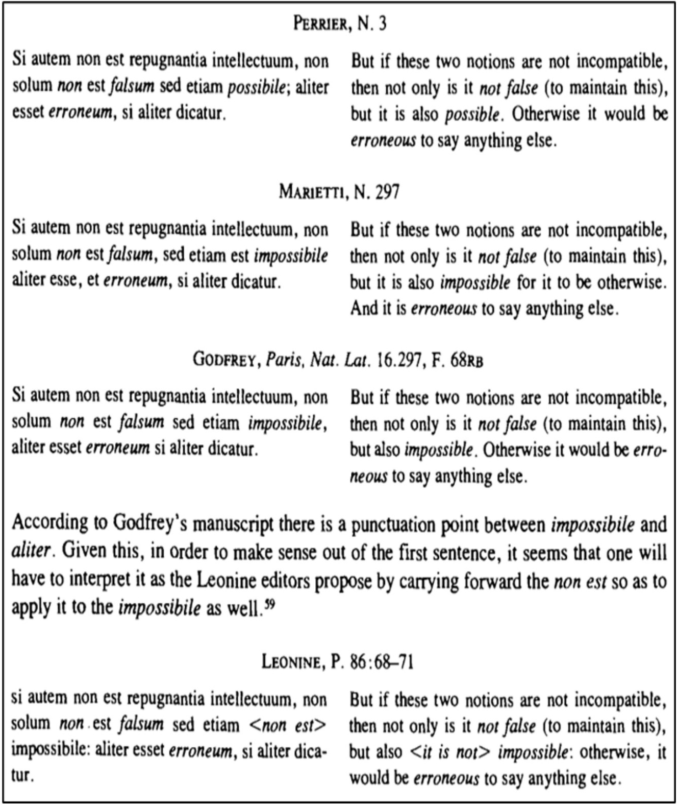 El problema de este punto es que solo funciona si se resuelve de un determinado modo una compleja dificultad textual en este pasaje, que implica dejar de lado la versión preferida por la edición leonina15 y tomar, en cambio, la de Perrier.16 En efecto, la edición leonina se apega aquí al texto tal como se encuentra en el manuscrito más antiguo con el que contamos de este opúsculo, el cual, traducido literalmente, dice un absurdo: “no solo no es falso, sino también imposible: de otro modo sería erróneo decir otra cosa” (§ 5).17 La edición de Perrier opta, en cambio, por una versión donde se reemplaza aquí el “imposible” por “posible”. Esto lo hace por buenas razones, pues, en efecto, la oración no tiene sentido si se deja allí el “imposible”. Sería como decir: “si no hay incompatibilidad entre las expresiones ‘Juan es hombre’ y ‘Juan es alto’, entonces esto no solo no es falso, sino también imposible”. Ante esta dificultad, los editores de la leonina recomiendan interpretar el pasaje como si el “no es” no aplicara solo a “falso”, sino también a “imposible”, es decir: “no solo no es falso, sino tampoco imposible: de otro modo sería erróneo decir otra cosa” (cfr. Comisión Leonina, 1976, pp. 79-80). Y hay también una tercera versión del pasaje, que es la preferida en la edición de Marietti,18 a saber: “no solo no es falso, sino también imposible que fuera de otro modo, y erróneo si se dijera otra cosa” (n. 297).19 Las tres versiones del pasaje cuentan con respaldo en manuscritos, y, en conjunto con la interpretación ofrecida por los editores de la leonina, conforman un elenco de cuatro alternativas sobre qué dijo allí santo Tomás.