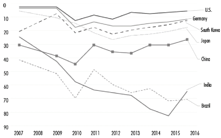 To a great extent, innovation performance reflects the efforts invested in new technologies. In a recent study, Scott (2017) featured a series of compound indices built to measure innovation; they consider research and development as a percentage of gross domestic product (GDP), the number of students enrolled in the sciences, the number of scientific publications, high-tech product exports, number and even quality of patents, and institutions, etc. The chosen sub-indices, their numbers, and their weightings vary depending on the compound indices calculated. The National Innovation Index, designed by the Chinese Ministry of Science and Technology, looks at 40 countries; China is currently ranked 18th, a slight improvement over 2011. The Bloomberg index includes 69 countries; China has been climbing the ladder since 2014, reaching spot 21 by 2016. The World Economic Forum index gathers together 135 countries; China was ranked 29th in 2009 and 2016, with a bump between 2010 and 2015. The Cornell University index, called INSEAD, considers 128 countries, and is constructed around 103 indices; China was ranked 25th in 2016 with a particularly high score on the sub-indices of technology and knowledge production (ranked sixth), and particularly low on quality of institutions (ranked 79th). Finally, in 2016, the United States earned the highest score, followed by Germany and South Korea, Japan, China, and much further down the list, India and Brazil (see Figure 1).