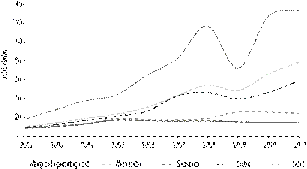 In the electricity sector (see Figure 1), the energy policy choices made resulted in the regulatory model tending towards an increasing separation between the operating marginal cost and the average (monomial) cost with respect to the price for the different categories of users. The differences between the monomial price and the price for large industrial users (or system coverage) tended to remain stable until 2008, with demand paying almost 90% of the energy price on average. By 2011, there was a decrease, with system coverage at 75%. The opposite was the case for residential consumers, whose coverage went from 90% in 2002 to barely 18% in 2011, which shows the design and objectives of the segmentation established by the energy policy. The difference between the electricity prices paid by the different users and the average cost of the system was covered by subsidies, which amounted to 1.2% of GDP in 2011 (Secretaría de Gobierno de Energía, 2019). The increase in the cost of the electricity sector was due to the lack of investment in the expansion of thermal power plants following the break with the marginalist model from 2002, which attempted to be compensated by supply contracts and public investment (Haselip and Potter, 2010; Navarro Rocha, 2021) and to problems upstream in the energy chain due to the decline in local extraction of natural gas (Serrani and Barrera, 2018), a key fuel since 60% of the electricity supply originates from thermal sources.