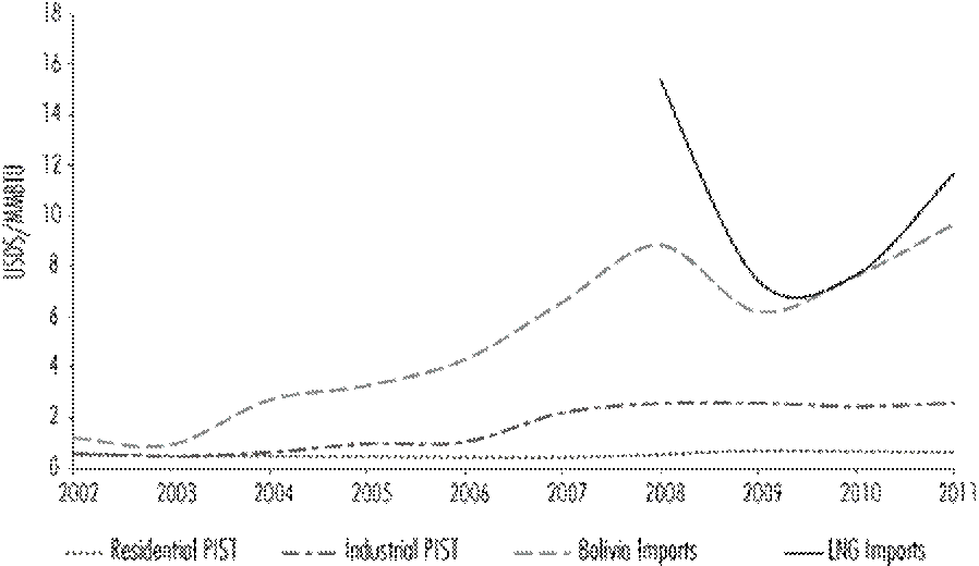 By the end of the Price Agreement in 2007, the difference between the two prices was 413%: USD$2.20 per million British thermal units (MMBTU) for industry versus an average of USD$0.43 for residential consumers (see Figure 2). The signing of the second price agreement for 2007-2011, although it managed to increase prices in dollars during the four years of implementation, it did so slightly below the increase in dollars of residential prices. During that period, the price paid by industry was 312% higher than that paid by residential consumers, with 2008 being the year with the most significant difference: 2.57 versus USD$0.54 per MMBTU (373%).