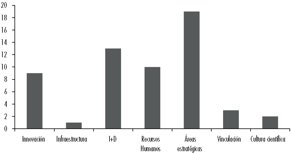 La mayoría de los instrumentos generados para la categoría de “áreas estratégicas” fueron fondos sectoriales. Estos, en conformidad con la RICYT (2016), tienen como objetivo generar marcos institucionales y esquemas de incentivos enfocados en temas sociales o económicos. Algunos ejemplos son el fondo sectorial de investigación y desarrollo sobre el agua, el fondo sectorial de investigación en salud y seguridad social, y el fondo sectorial de investigación ambiental, entre otros.