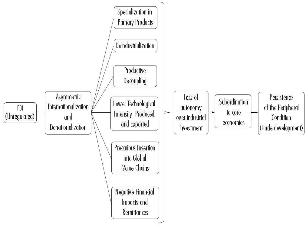 The diagram above illustrates the outcomes observed in Latin American economies following the trade and finance liberalisation of the 1990s. This liberalisation led to an influx of unregulated FDI and facilitated a process of asymmetric internationalisation, which, to some extent, both stimulated and coincided with the weakening of the domestic productive structure. Latin American economies experienced specialisation in commodities, deindustrialisation, productive decoupling, reduced technological intensity in production and exports, precarious integration into global value chains, and negative financial impacts, particularly regarding the repatriation of profits and interest payments. Simultaneously, the increasing dominance of multinational corporations over the productive structure diminished national autonomy in domestic industrial investment. This phenomenon both perpetuated the process of asymmetric internationalisation and denationalisation and reinforced the peripheral condition of underdevelopment.
