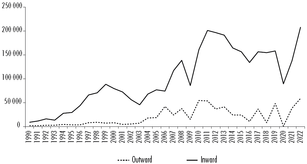 The asymmetric internationalisation of Latin American countries is evident in Foreign Direct Investment (FDI) flows. Figure 2 highlights this trend in the region. In 1990, there was a relative balance between the investments made by and received by Latin American countries. However, since then, a widening gap has emerged between inward and outward FDI. For example, in 2022, only USD$59 billion was invested outwardly, whereas USD$208 billion flowed inwards. This growing disparity indicates a rising trend of denationalisation of domestic firms in favour of foreign entities, further reinforcing the increasing process depicted in the previous diagram (see Figure 1).
