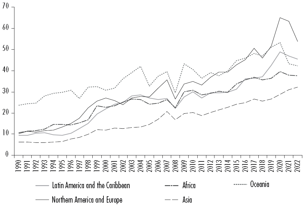 The importance of foreign capital in domestic economies can be assessed by examining the stock of FDI relative to GDP. Figure 3 demonstrates that. Since the 1990s, economic globalisation has significantly increased the share of foreign capital in national economies worldwide, though the extent varies. For instance, in 2022, the stock of FDI relative to GDP was 37.52% in Africa, 30.94% in Asia, 42.17% in Oceania, and a high 45.33% in Latin America. This indicator is even higher in North America and Europe. However, the investment dynamics in core countries do not exhibit a domination characteristic, implying that there is no asymmetric internationalisation of production or causality concerning its adverse effects.