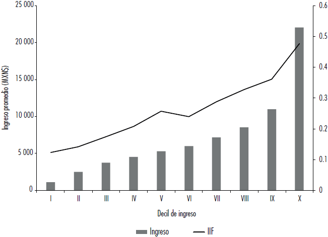 Una vez construido el índice, se observa una relación significativa entre el nivel de ingreso y el nivel de inclusión financiera. Ello es particularmente patente si la muestra de la ENIF se divide por niveles de ingreso. La Figura 2 muestra la totalidad de observaciones de la muestra, agrupadas por deciles. El decil I corresponde al 10% de las observaciones de menor ingreso promedio, mientras que el decil X muestra al 10% de las personas encuestadas de la ENIF de mayores ingresos. Se observa un patrón que relaciona al nivel de ingreso con el valor del IIF estimado. Entre mayor es el nivel de ingreso, tiende a ser mayor el IIF. Ello en principio, puede ser un indicador de una relación en la que a medida que crece el nivel de ingreso, algunos factores socioeconómicos y demográficos como, por ejemplo, el nivel educativo, la edad, o el estado civil, comienzan a afectar las decisiones financieras de los agentes, de la misma forma que decrece el nivel de riesgo percibido por parte de las instituciones financieras, debido a la mayor capacidad de pago.