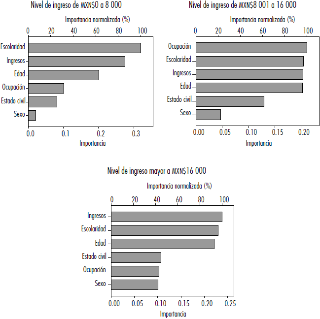 De esta forma, el análisis de la importancia de la variable arroja los siguientes resultados para cada uno de los tres grupos de ingreso.