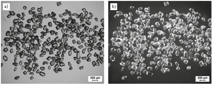Figure 1 Photomicrograph of selected apatite crystals for ID-TIMS analysis from sample MCH-17 using (a) transmitted and (b) reflected light. Note that most of crystals are free of inclusions or fractures.
