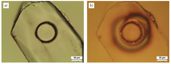 Figure 2 Photomicrograph of an apatite crystal after ablation in (a) transmitted and (b) reflected light. Spot diameter (center of the crystal) is 60 μm. The selected crystals for LA-ICP-MS analysis are free of inclusions or cracks. Note the concentric deposits of ablated material around the crater in reflected light (b).