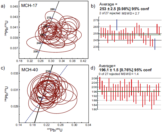 Figure 3 U-Pb Concordia diagrams (Wetherill, 1956) and weighted average 206Pb/238U age plots of zircons from samples MCH-17 (a and b, respectively), and MCH-40 (c and d, respectively). Blue bars correspond to rejected data.