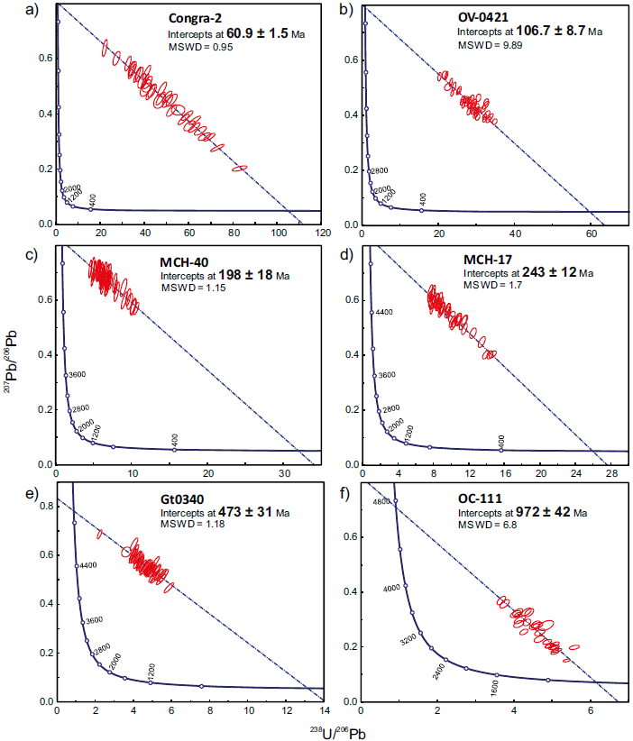 Figure 4 Tera-Wasserburg Concordia diagrams for U-Pb data of apatites from samples: (a) Congra-2; (b) OV-0421; (c) MCH-40; (d) MCH-17; (e) GT-0340; and, (f) OC-111.