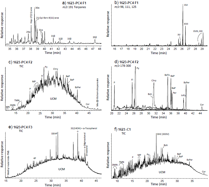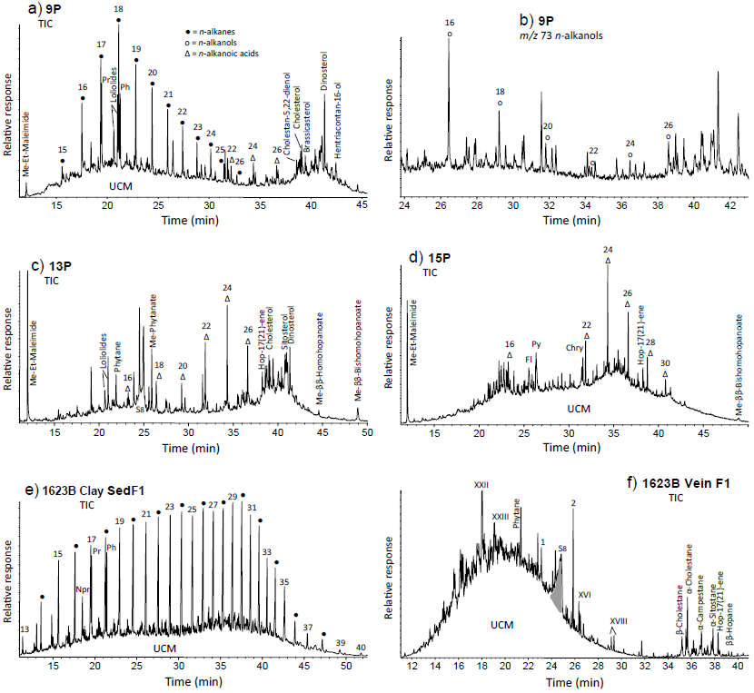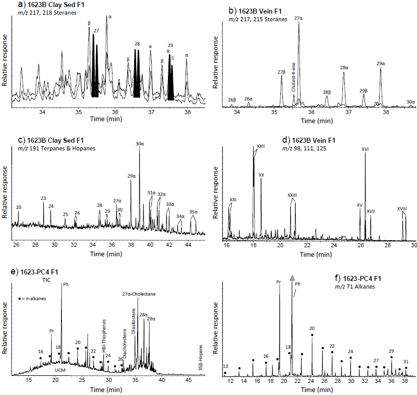 The only unaltered hydrothermal petroleum was extracted from the bulk matrix of the brown claystone (Figures 2e and 4a, 4c). Whereas, the oil in the veins of the same sample was a biodegraded petroleum residue of UCM, biomarkers and alkylthiophenes (Figures 2f and 4b, 4d), which may reflect heat driven emplacement of bulk biodegraded oil. The presence of alkylthiophenes indicated that this sample had experienced sulfurization reactions. The petroleum in the chimney fragment (1623-C1) is comprised of a major UCM with superimposed PAH and alkyl-PAH, including Diels' hydrocarbon (Figure 3f). It is a typical aromatic residue of hydrothermal petroleum pyrolysate that permeated and solidified in the chimney when active. The extracts of the push cores adjacent to the weathered mound reflect similarities to the core samples (9P, 13P, 15P above) in that the n-alkanes are mostly biodegraded, leaving a dominance of phytane and pristane (e.g.Figure 4e, 4f), with immature biomarkers (e.g.Figure 3a, 3e). The presence of alkylthiophenes and high amounts of aromatics, including PAH (Figure 3b, 3c, 3d), support the overwhelming influx of biodegraded hydrothermal petroleum into these sediments. The polar fractions of the mound samples (e.g.Figure 3e) contained residual stanols, dinosterol, tocopherol and alkylmaleimides, reflecting the contemporary lipid input analogous as described for the core samples.