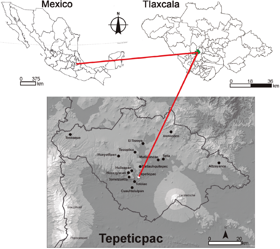 The discovery took place on an alluvial deposit exposed by a crosscutting road on the hillslopes of Tenextepetl hill, which is part of a mountain chain system that elevates around 300 meters above the Puebla-Tlaxcala valley and that separates the bottom of the valley to the south from the elevated Tlaxcala Block to the north.