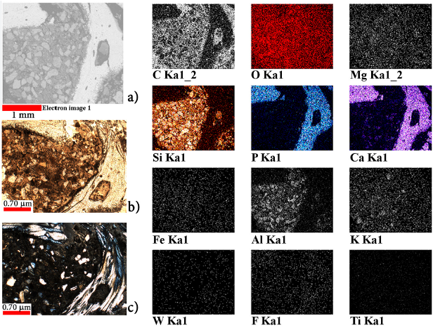 Figure 10 Volcanic sand and its elemental composition. a) SEM image of the thin section with a fragment of bone and sand filling. b)Same area in thin section (ppl). c) Same area with cross-polarized light (xpl). At right, we can see the elemental mapping; the volcanic sand fraction is composed mainly by silicium, aluminium and oxygen, with other elements such as magnesium, calcium, iron, potassium.