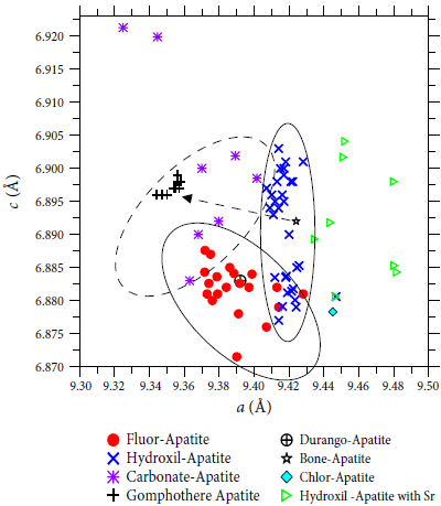 Apatite is a mineral group with complex solid solutions. In order to simplify, the International Mineralogical Association (IMA) accepted minerals considering three end members: hydroxylapatite, fluorapatite and chlorapatite (Chang et al., 1996; Back, 2014). The different size of monovalent anions (F-, Cl-, OH-) determines a variation in cell parameters. The informal names francolite and dahllite have been applied for apatites enriched in CO2 and fluorine, and apatites enriched only in CO2, respectively (Deer et al., 2013).