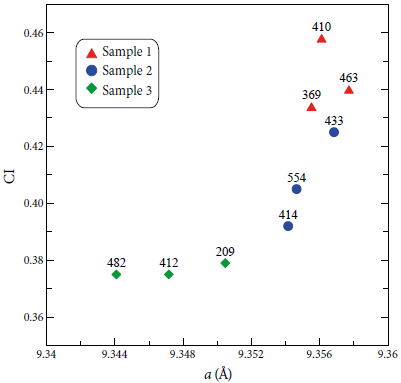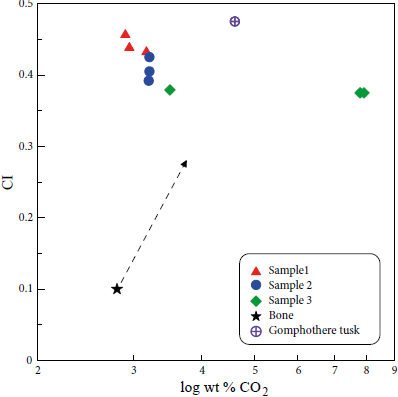 The carbonate-apatite mineral phase in the skull bone has a negative correlation between "crystallinity index" and CO2 amount and a cell parameter (Figures 12 and 13). Carbonate has the effect of making the apatite less crystalline (e.g.Nemliher et al., 2004). In the studied samples it can be prove this as an indirect relationship between CO2 content and "crystallinity index" (Figure 13). Sample 3 is enriched in CO2 and because of that it is less crystalline and has a smaller crystallite size value. Carbonate in apatite constrains the crystallinity to nanometric scale and gomfotherium fragments have quite big size values of crystallite. Therefore, we suggested a partial isomorphous exchange of carbonate by fluorine in apatite as a result of the diagenetic processes.