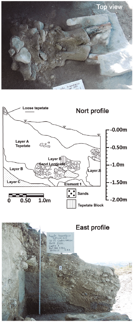 The uppermost stratum was formed of 20 to 30 centimeters of loosened tepetate rock that had a steep north to south inclination, which matches the present day-slope surface. It contained no paleontological remains. Below the upper stratum lays Layer A, a colluvial stratum consisting of blocks of medium size blocks (10 to 20 cm) of calcareous rocks and fragments of tepetate rock (fragipan-indurated tephra material). The deposit also had a north to south slope and a thickness of around 1 meter; it was strongly compacted, although some sand lenticular deposits were observed on the north and west profiles.