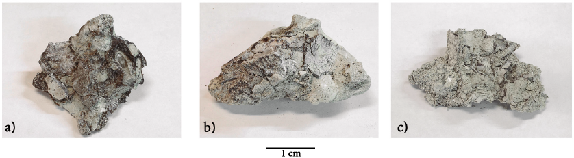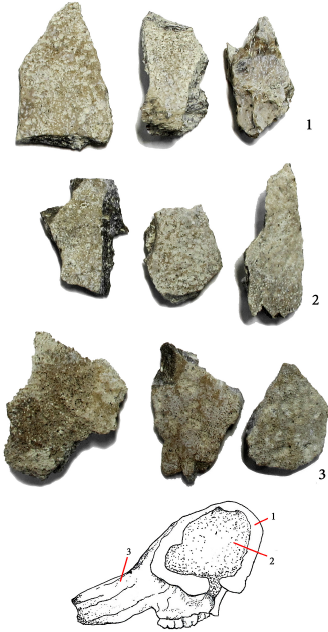 Samples of detached cortical bone, that was better conserved than the trabecular, were classified in three categories according to their anatomical position, color and porosity: 1- frontal bone with a white yellowish color in the anterior face, the internal side of the cortical bone has a brownish color, they both have low porosity and diagenetic alterations such as pitting and delamination; the pittings and surfaces losses were filled with a white material; 2- temporal bone with a brownish yellow color with more porosity and irregularities in the superficial area of the bone, the pores are filled with white and opaque mineral and with a translucent mineral. The internal face is black; 3- alveolus, the bone has a darker color and has more pores and other cavities which are filled with a white mineral. The internal face is black (Figure 4).