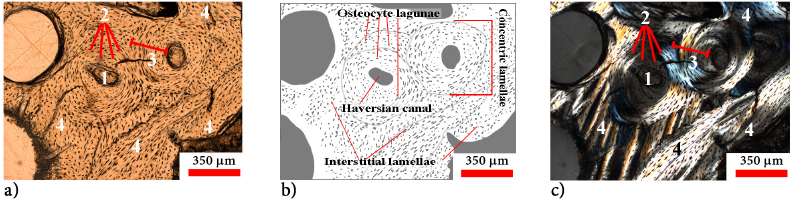 Figure 6 a) Thin section of cortical bone under ppl; b) Diagram of cortical bone; c) Same section of cortical bone under xpl. In both micrographs the Haversian system (osteons) is seen: concentric lamellae (3) growing around the Haversian canals (1), osteocyte lacunae (2) are also visible as well as the interstitial lamellae (4).