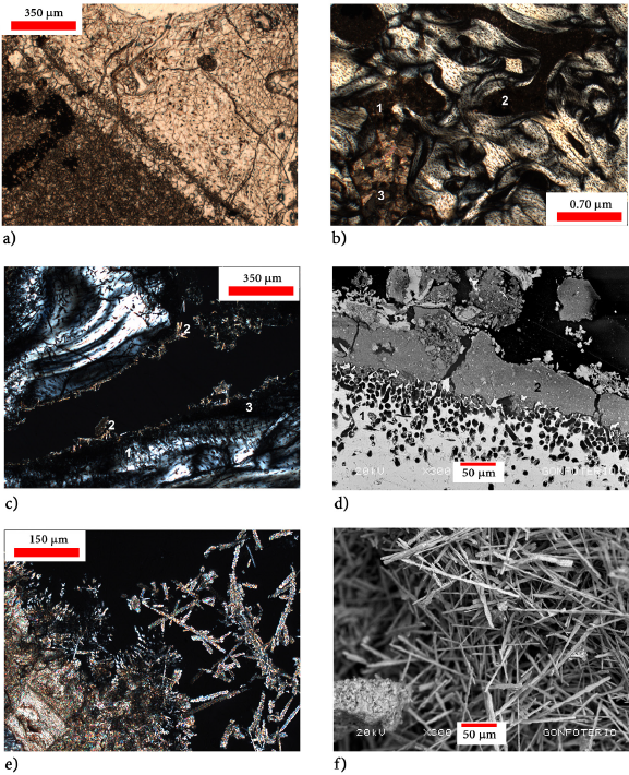 Figure 7 Bone alterations. a) Fissures and fractures, only the wider fractures are filled; thin section (ppl). b) Thin section of cortical bone (xpl), 1) reabsorption of the bone visible in Haversian canals that have lost their oval shape, 2) canals filled with micrite, 3) canals filled partially with sparite. c) Thin section of the surface of cortical bone (xpl), 1) tunneling with a rounded end, 2) lublinite in surface, 3) micritized bone, the material have lost their birefringence. d) SEM micrograph of thin section of cortical bone, 1) tunneling with rounded ends, 2) layer with different composition of the bone, not all the tunnels are filled. e) lublinite, thin section (xpl). f) Lublinite, SEM micrograph.