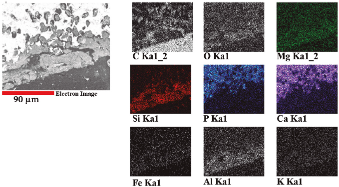 Thin sections showed a material with no birefringence in the surface area of the sampled bones composed mainly of Si, Al, O, Mg, Fe, and K (Figure 7c-3 and Figure 8), over this layer a micritic one can be found. At the surfaces that exhibited the tunneling, but not the layer of minerals without birefringence, the voids have been filled with micrite.