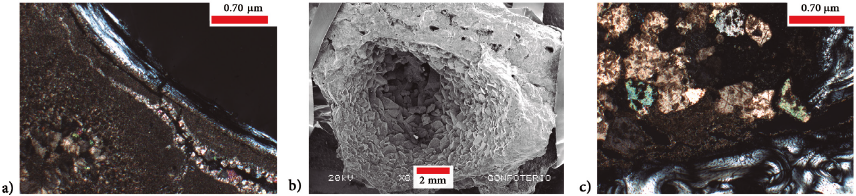 Figure 9 a) Trabecular bone with parallel lamellae and several fissures, the filling consist in a micritic layer with sparitic recrystallization in fractures and other areas, thin sections (xpl). b) SEM image of the crystalline sparitic layer in spaces not completely filled. c) Bone with layer without birefringence, layer of micrite and then sparitic cement, thin section (xpl).