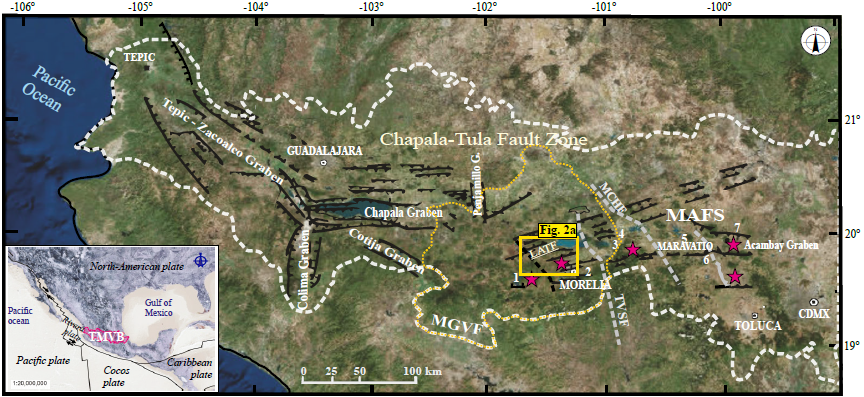 The TMVB is a volcanic arc located in central Mexico, between 19°N and 21°N, formed by the interaction of the Cocos, Rivera, and North-American plates since the Miocene (Mooser, 1972; Demant, 1978; Ferrari et al., 2012). The central part ofthe TMVB is deformed by the extensional Morelia-Acambay fault system (MAFS, Figure 1). This system belongs to the Chapala-Tula fault zone and includes some of the most active crustal faults in Mexico. This fault system is also influenced by the Quaternary activity of the Michoacán-Guanajuato Volcanic Field (Johnson and Harrison, 1990; Hasenaka and Carmichael, 1985).