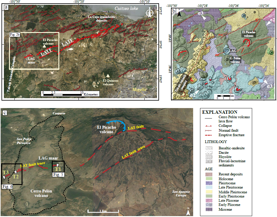 The LATF is located in the northern part of the state of Michoacán, 30 km northwest of the capital, Morelia, within the Michoacán-Guanajuato Volcanic Field (MGVF) and the western portion of the MAFS (Figure 2). The area is a transition zone between Miocene volcanic activity and the Quaternary volcanism of the TMVB which renders the faulting poorly detectable around Cuitzeo. The oldest rocks exposed in the area are Miocene andesite (~19 Ma) and dacitic ignimbrite of the Mil Cumbres sequence, followed by a Miocene-Pliocene fluvial-lacustrine sequence of the Cuitzeo paleo-basin, Pleistocene andesite and dacite from the El Tzirate Volcanic Complex and Holocene basaltic andesite of the MGVF (Figure 2b) (Pasquarè et al., 1991; Garduño-Monroy, 1999; Israde-Alcántara et al., 2010; Gómez-Vasconcelos et al., 2015; Pérez-Orozco et al., 2018).