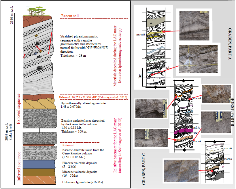 Figure 3 Left: Simplified stratigraphic sequence of the volcanic deposits in the area of the La Alberca de Guadalupe (LAG) maar (Not to scale). The inferred sequence and the dates are by Kshirsagar et al. (2015). Right: Details of the faulted phreatomagmatic sequence and photographic record of its structures: folding, andesitic lithic and impact sag, small scale graben-horst geometry, cross-stratification, accretionary lapilli with diameters between 0.2 and 1.5 cm, micro-faulting and ash deformation, and fault affecting material of varied granulometry (thick lapilli to fine ashes). Abbreviations: macrA = masive layer of ash with accretionary lapilli; sA = Stratified, fine ash layer; mLA = massive, fine ash layer.