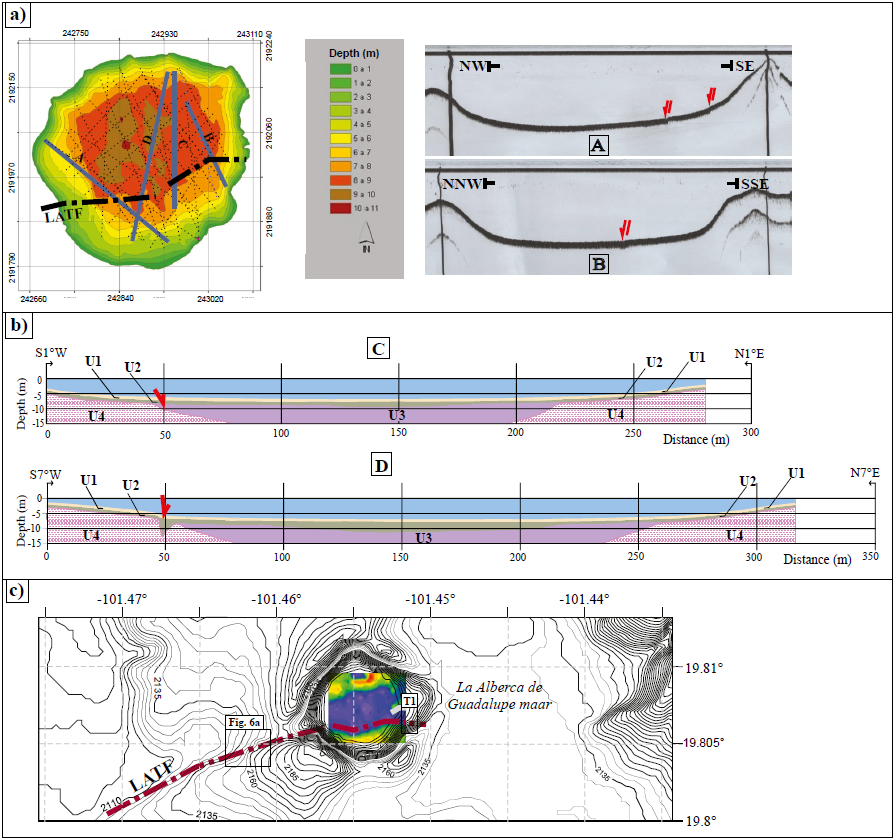 Figure 4 a) Bathymetric map and localization of acoustic profiles through the lake of the LAG maar. Profiles A and B record displacement in the lacustrine floor, the arrows indicate anomalies. b) Sonograms of profiles C and D showing different sedimentary units and displacements in the lacustrine floor. c) Topographic map combined with the reduction-to-the-pole regional magnetic data map (colors). The dotted line indicates the La Alberca - Teremendo fault trace.
