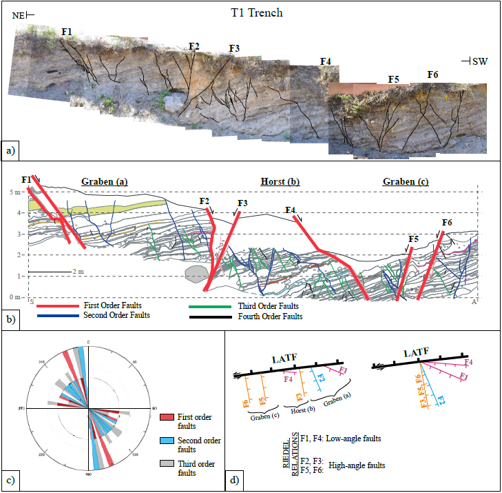 Figure 5 a) Composed photography of the trench T1, an artificial outcrop exposed along the path that connects the crater border with the lake, inside the LAG maar. In the photo, the main faults are delineated. b) Simplified diagram of T1 with the main faults identified (first-, second-, third- and fourth-order). c) Rose diagram of the measured faults indicating a preferential NW-SE strike. d) Sketch map showing the orientation of these outcrop-scale faults with respect to the La Alberca-Teremendo fault and their interpretation as Riedel faults.