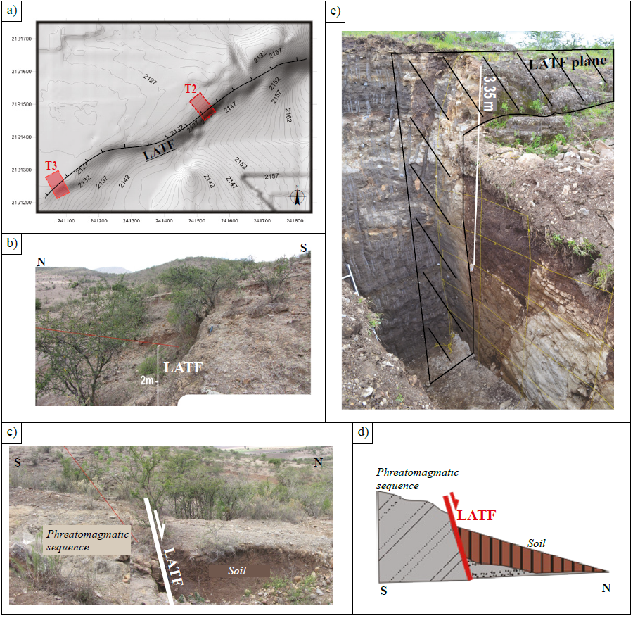 T2 shows the LATF trace and three smaller antithetic faults (A1-2-3, Figure 7), as well as second- and third-order faults and associated fractures, which displace the phreatomagmatic sequence. The LATF is a normal fault trending N260° and 76°NW dip; at the bottom, it changes to vertical, and at the top has an 89° dip, and a 60° rake. It has a total vertical displacement of335 cm and a net vertical displacement of262 cm. The antithetic faults that limit the blocks were identified as A1 (N60°E-80°SE), A2 (N80°E-60°SE) and A3 (N85°W-80°SW). These faults accumulate a vertical displacement of 73 cm (10 cm for A1, 57 cm for A2, and 6 cm for A3). The hanging wall shows a domino-style, normal faulting, integrated by three blocks which rotate 8° to 15° away from the foot wall; the spaces between blocks (4 to 61 cm) are filled with a mix of phreatomagmatic materials and soil (Figure 7).