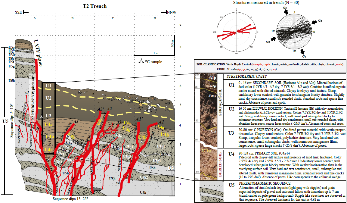 Figure 7 Log of trench T2, rose diagram of the fault planes exposed, directions of the stress field, and pedological analysis and classification of the soil affected by the LATF. Abbreviations: A1-3 = Antithetic faults; s1-5 = second order faults; LATF = La Alberca-Teremendo fault.