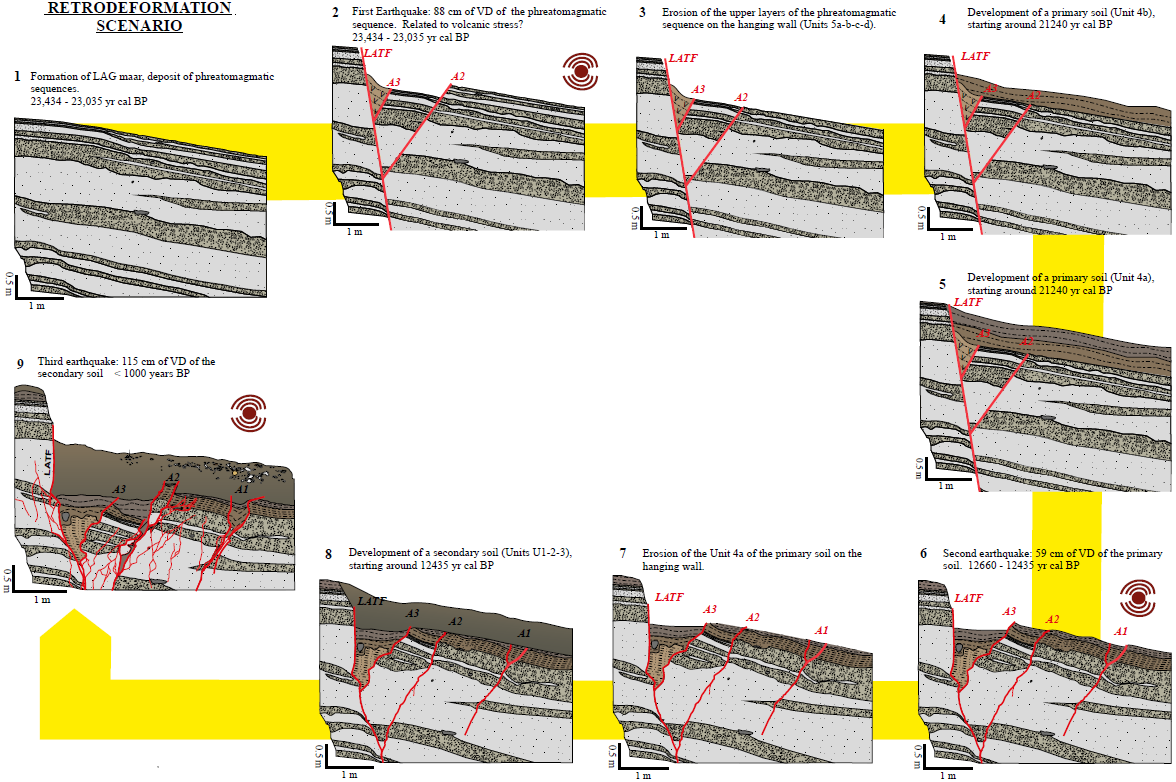 Paleoseismic analysis suggested that the fault has moved three times in the past 23000 years: the first was a volcano-tectonic event that could be cogenetic to the LAG maar emplacement; we assume a moderate to low magnitude for this event. The other two events were observed more clearly and were related to earthquakes with magnitudes Mw of 6.6-7 if we assumed that they were the result only of tectonic stress.